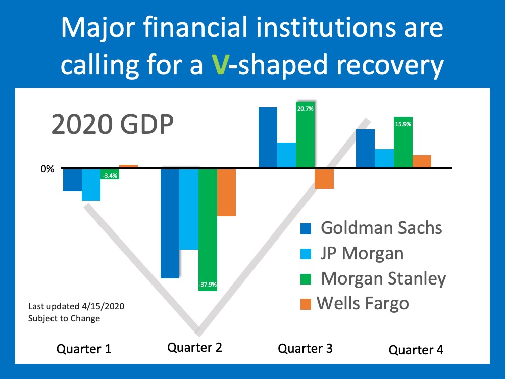 No one can answer this question with one hundred percent certainty. However, most top financial services firms are calling for a V-shaped recovery. Goldman Sachs, Morgan Stanley, Wells Fargo Securities, and JP Morgan have all recently come out with projections that call for GDP to take a deep dive in the first half of the year but have a strong comeback in the second half.